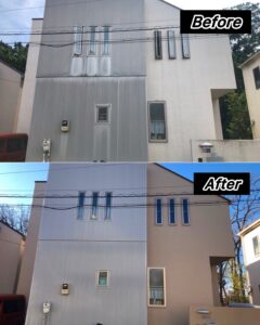 雨だれでくすんでいた外壁も、塗装でここまでスッキリ✨